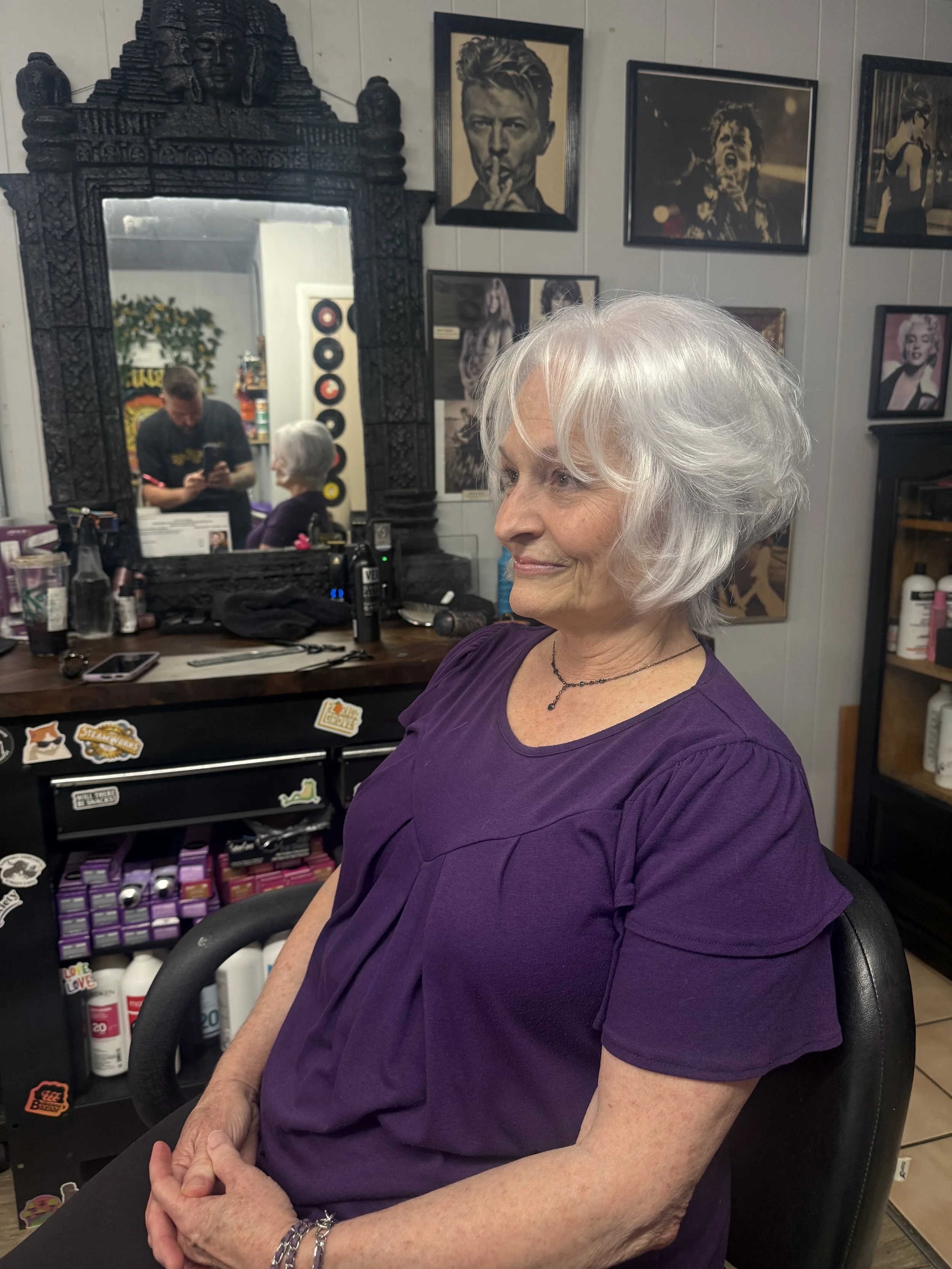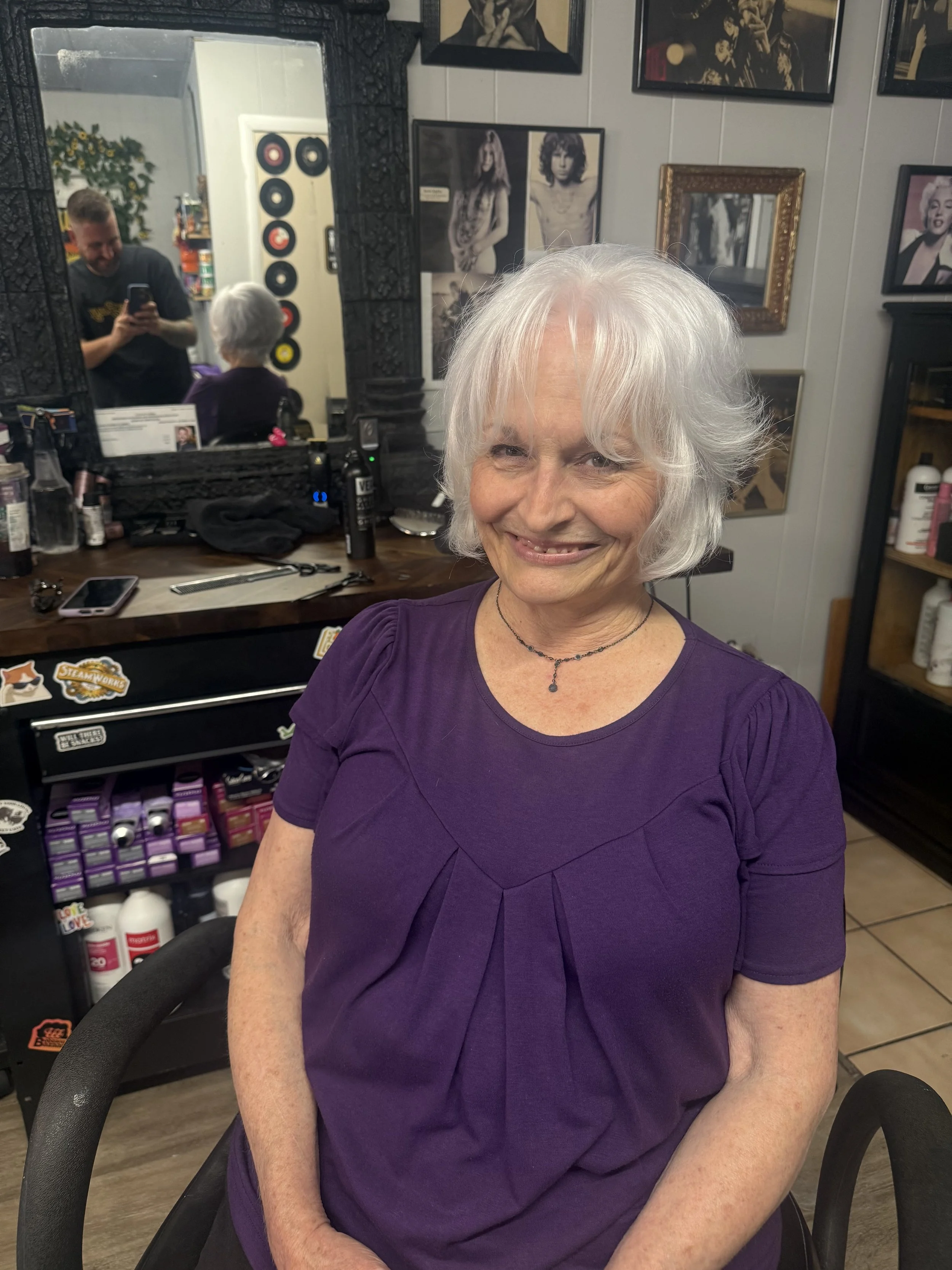 Working inside Hair Lair in downtown NPR gives me the perfect space to grow. Every Snip Happens service — men’s cuts, women’s cuts, texture shaping, silver transformations, and everything in between — is crafted right here.